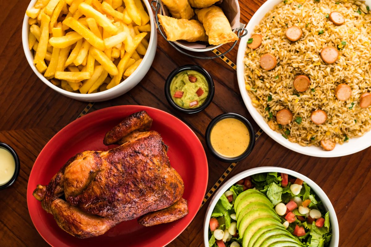 1 pollo a la brasa, papas fritas, 1 guarnición a elegir, 1 gaseosa 1.5 lt, salsas (4 ají pollero, 4 mayonesa)